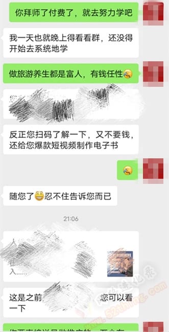 就在刚刚,一条陌生的信息。对方自称“有空向你学习”,于是我加为好友,紧接着,她就发了一天广告,夸赞课程很好,建议我去学习。