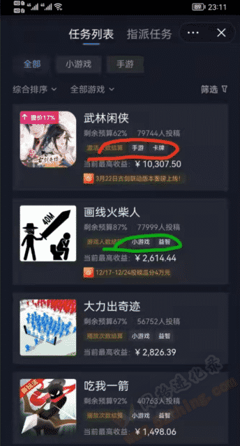 然后点任务列表,注意有手游,有小游戏。上面说过,小游戏要实名,流量没以前好了。建议直接干手游,单价又高。