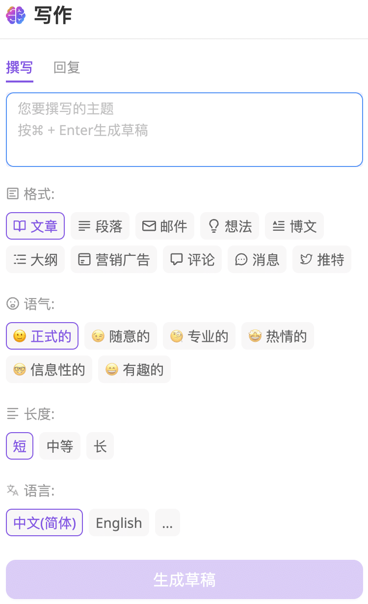 你只要告诉它你要写啥,稍微调整一下风格、长度,接着就能得到一篇完整的文章。复杂的提示词?那是用其他工具的事!