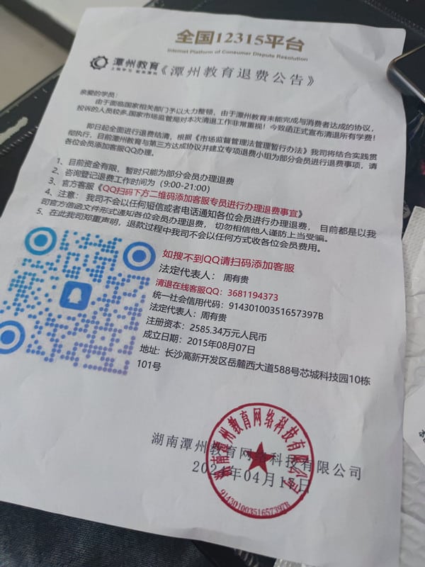 而后在去年,也就是2023年年底有收到自称潭州教育退费的电话。