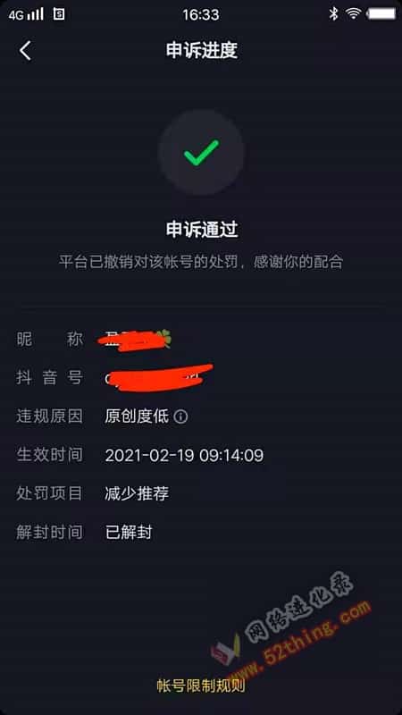 5、提交申诉后不能继续上面的操作申诉,需进入【抖音申诉-申诉记录】菜单,便可进行重复无限申诉