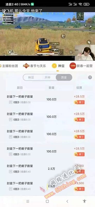 话说虎牙竞猜项目并不是最近才有,毕竟属于小众产品,知道它的人多数都是虎牙玩家。在虎牙直播界面,有个种豆按钮入口(之前叫做“玩竞猜”),直接点击后就能看到种豆情况,如下图: